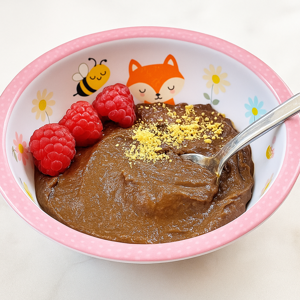 A healthy chocolate pudding is shown topped with raspberries and graham cracker crumbs. pinit Eat your Veggies gluten-free Gluten Free Plate Good for Infants Sour Good for Picky Eaters quick-meals Quick Meals cup Toddler Favorite