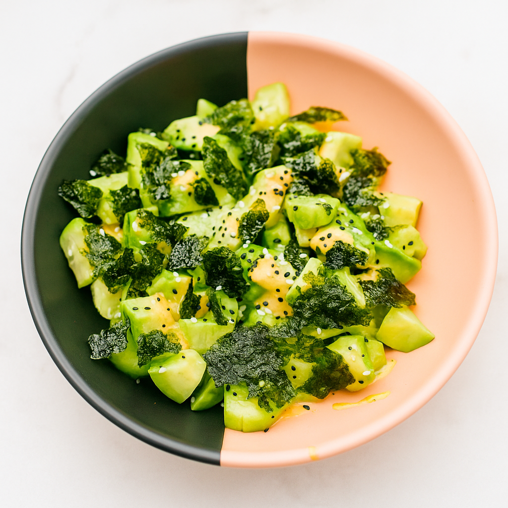 cucumber and avocado salad, topped with soy and mayo dressings and seaweed snacks. pinit Easy to Make Eat your Veggies plant-based Vegetarian Meals