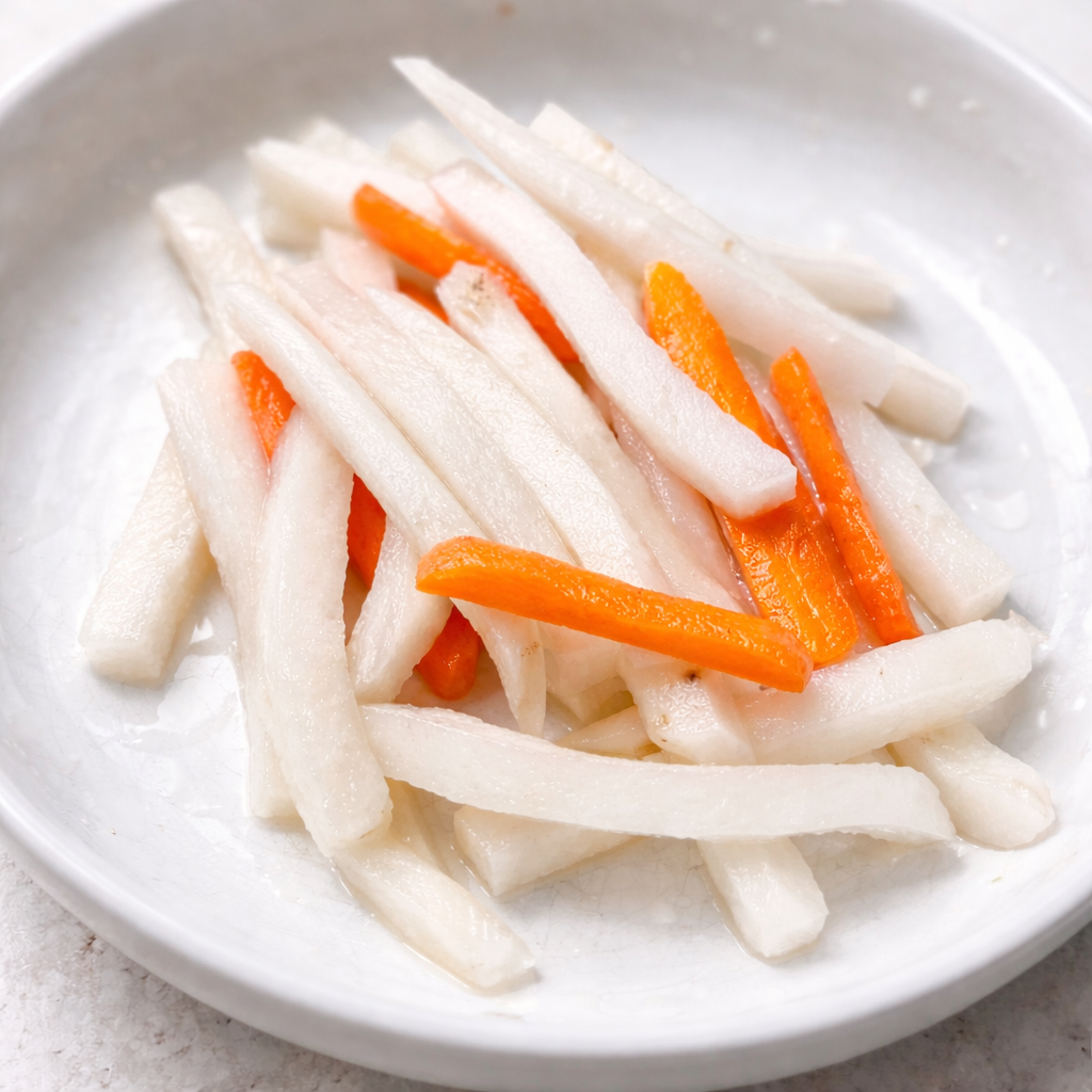 If long strips feel intimidating or unfamiliar, dice the daikon and carrots into small cubes. Bite-size pieces are easier to manage and often increase the likelihood of trying something new.