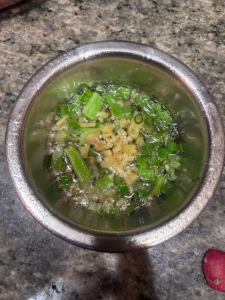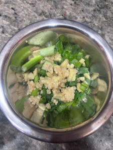 Sauce, Part II: heat a wok or small sauce pan to Medium High; once hot, pour in oil and cook for one minute. Pour hot oil into bowl of cut scallions and ginger, shaking bowl slightly to ensure all of the bowl’s contents are in the oil. Allow the liquid to steep and cool for a few minutes before using.