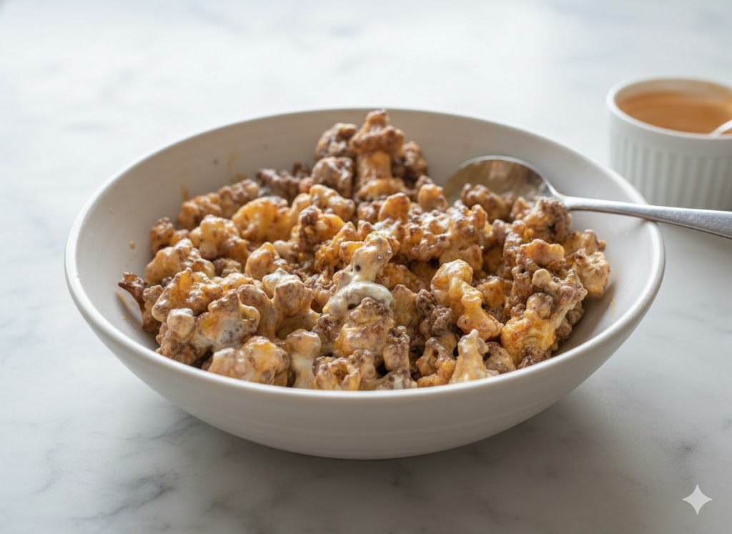This mild buffalo cauliflower comes together with simple pantry staples and a light kid-friendly sauce. Bite-sized cauliflower florets are coated in a thin crispy layer, air fried until golden, and dressed in a tangy, not spicy buffalo glaze with a touch of blue cheese for creaminess.