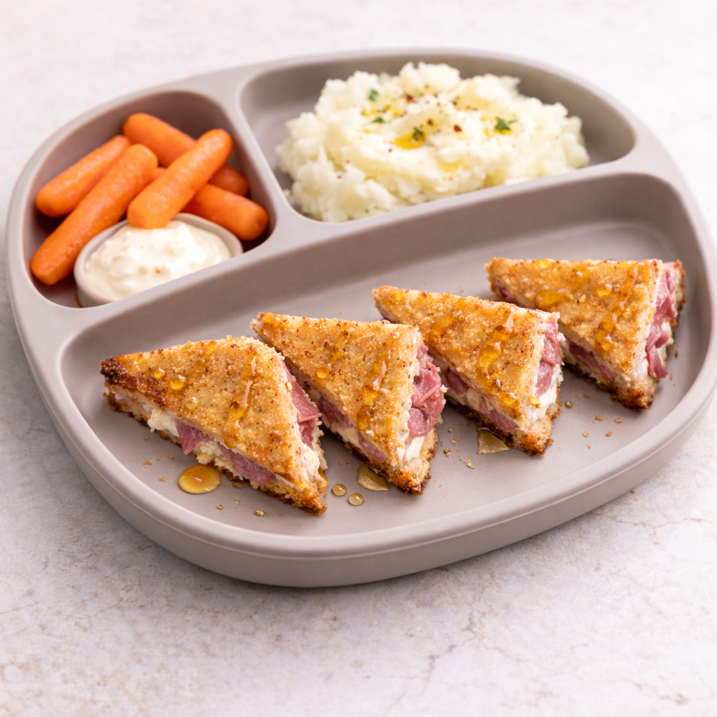This crispy grilled sandwich turns simple meat and cheese into a pressed, golden, toddler-friendly lunch. Flexible ingredients, crunchy edges, and a drizzle of honey make it next-level.